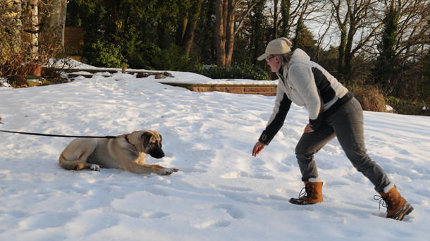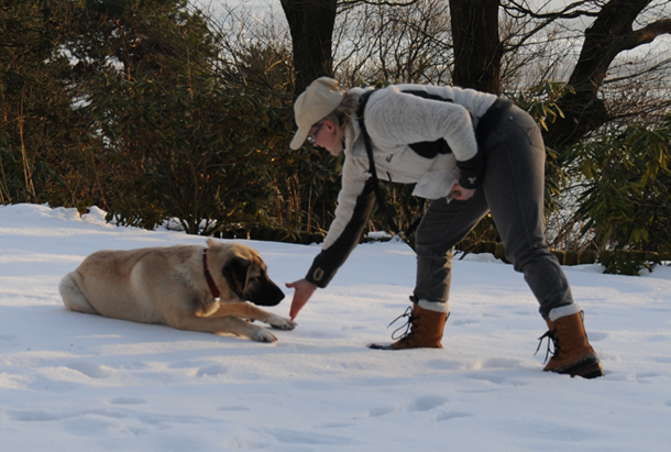 Das „Platz“-Kommando ist gut geeignet für Begegnungen mit Joggern oder Radfahrern. Diese sind immer sehr dankbar, wenn ein so großer Hund gut gehorcht und nicht so bedrohlich wirkt.