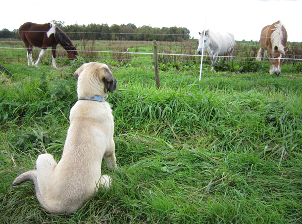 Gerade Pferde sind Fluchttiere, da man auf dem Lande öfters Reiter trifft, sollte ein ruhiges Verhalten ihnen gegenüber geübt werden, Sirin lernt das gerade, 2010