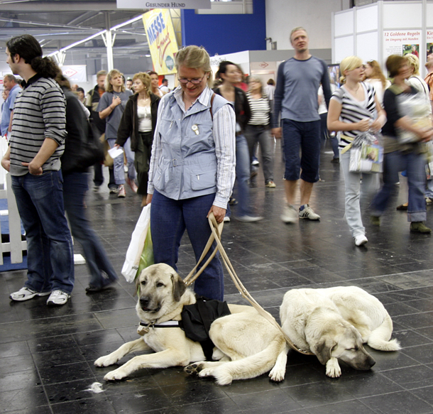 Um seinen Hund auf eine Ausstellung als Besuchshund oder als Ausstellungshund zu zeigen, sollte er mit vielen Menschen, Hunden und lautem Trubel, engen Gedränge und glatten Böden vertraut sein. Üben Sie das frühzeitig mit ihm. Sind Sie sich nicht sicher ob er das kann, nehmen Sie ihn mal mit in die Stadt. Ist er dort schon völlig überfordert weil er das nie kennen gelernt hat, wird ein Ausstellungsbesuch eher schwierig sein. Dann müssen Sie mit Ihrem Hund ersteinmal viel üben, bevor er mitgebracht werden kann. Macht er das ganz gut, Sie wissen aber nicht, ob Sie ihn bei dem dichten Gedränge auch halten und kontrollieren können, benutzen sie ein Kopfhalfter (Kopfhalfter wie beim Pferd)