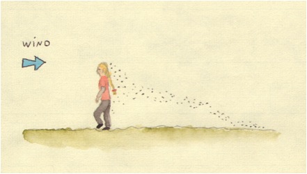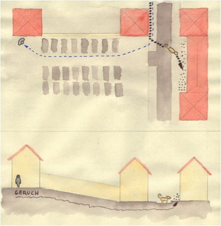 Der Hundeführer hat während des Trailens, die Aufgabe mitzudenken! Man hängt nicht einfach am anderen Ende der Leine und lässt den Hund arbeiten. Das Gelände muss immer genau und richtig einbezogen werden. Auf der Skizze oben seht Ihr die Aufsicht und die Ansicht eines Geländes, wo Ihr Eurem Hund helfen könnt/müsst. Der Geruch fällt den Hügel herunter und sammelt sich an einer Hauszeile gegenüber, die vorbeifahrenden Autos verteilen den Geruch noch weiter die Straße entlang. Der Hund läuft richtig dem Geruch hinterher, sucht die Hauszeile ab, läuft noch etwas die Straße auf und ab, zeigt aber an, dass der Geruch dort schwächer wird. Ihr seht, dass er körpersprachlich den meisten Geruch gegenüber dem Hügel hat. Ihr seht auch, dass die Zielperson aber nicht dort ist. Nun solltet Ihr helfen, indem Ihr einen Perimeter geht. Dieser muss bis auf die Hügelkuppe führen oder sogar noch darüber hinaus, damit der Hund den Trail wieder finden kann. Die Thermik hat Einfluss auf den Trail: Kalte Luft fällt herunter, warme Luft steigt auf und mit ihr auch die Geruchspartikel.