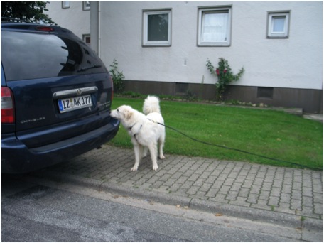 Auch ein Auto ist ein Geruchsträger. Da man es unterwegs auf den Trail schlecht mitnehmen kann sollte man, wenn man keinen anderen Geruch der zu suchenden Person hat, einen Abstrich der Autotürklinke mit einem Pad nehmen. Der lässt sich leichter transportieren. Mira nimmt noch einmal eine Nase voll Geruch auf, bevor sie anfängt, mich zu suchen.