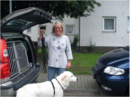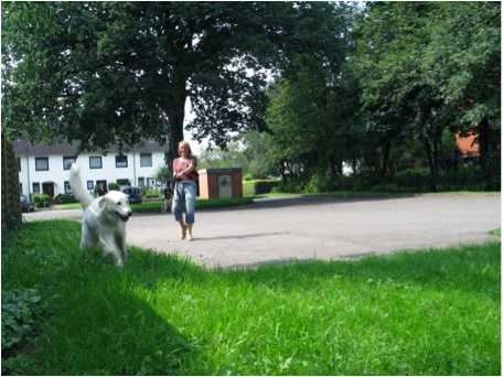 Ich möchte euch jetzt auch noch Mira vorstellen, sie ist eine Kuvasz-Mix Hündin, Silke Stave hat mit ihr im Januar 2007 angefangen zu trailen, da war sie 3 Jahre alt. Aus Zeitgründen - sie hat ihre eigene Hundeschule - trailt sie eher unregelmäßig.