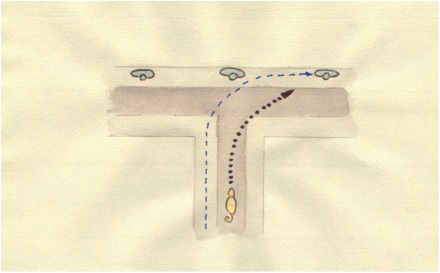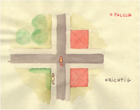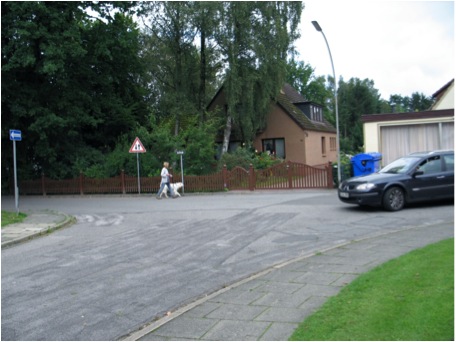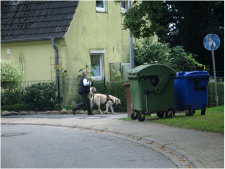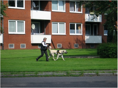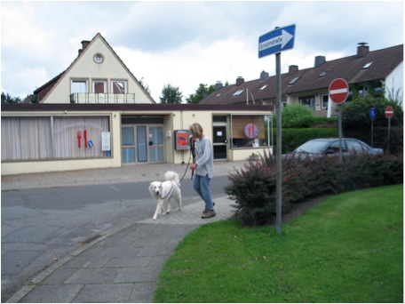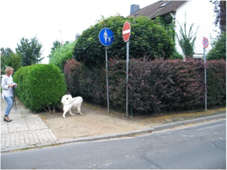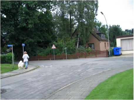 Den richtigen Ansatz/Abgang zu wählen, ist nicht so einfach. In der Mitte einer Kreuzung oder eines Platzes ist wahrscheinlich nicht mehr so viel Geruch. Der Wind verweht es, und vorbeifahrende Autos lassen eine Sogwirkung entstehen, die den Geruch noch mit sich zieht. Auch an Stellen, wo die Person nie war. An Hauswänden oder Hecken hat sich aber möglicherweise der Geruch gefangen, so dass man den Hund besser dort Ansetzt und ihn suchen schickt. Da man vorher hier einen „four corners“ gegangen ist, konnte man hoffentlich schon in der Körpersprache des Hundes erkennen, wo er den aktuellen Geruch hatte, und setzt ihn dann in dieser Richtung an.