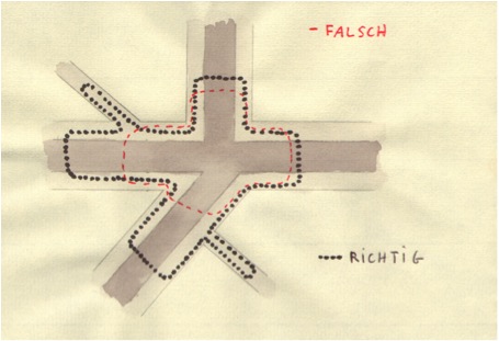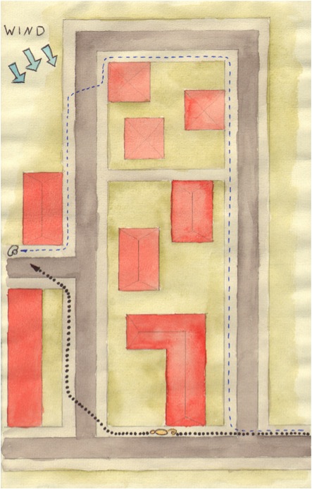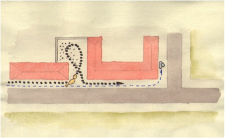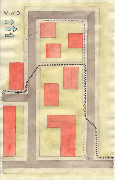 So oder eben auch anders könnte der Trail verlaufen. Wenn man Übungstrails anlegt, sollte man sich darüber im klaren sein, was man heute üben will, und was man vermeiden muss, damit es auch gut läuft. Die Person die sich verstecken soll muss entweder selbst erfahren im Mantrailing sein, oder vom Flanker sehr gut eingewiesen werden. Um unerwünschte Überschneidungen zu verhindern, auch die Anfahrt zum Trailtreffpunkt muss mit bedacht werden.